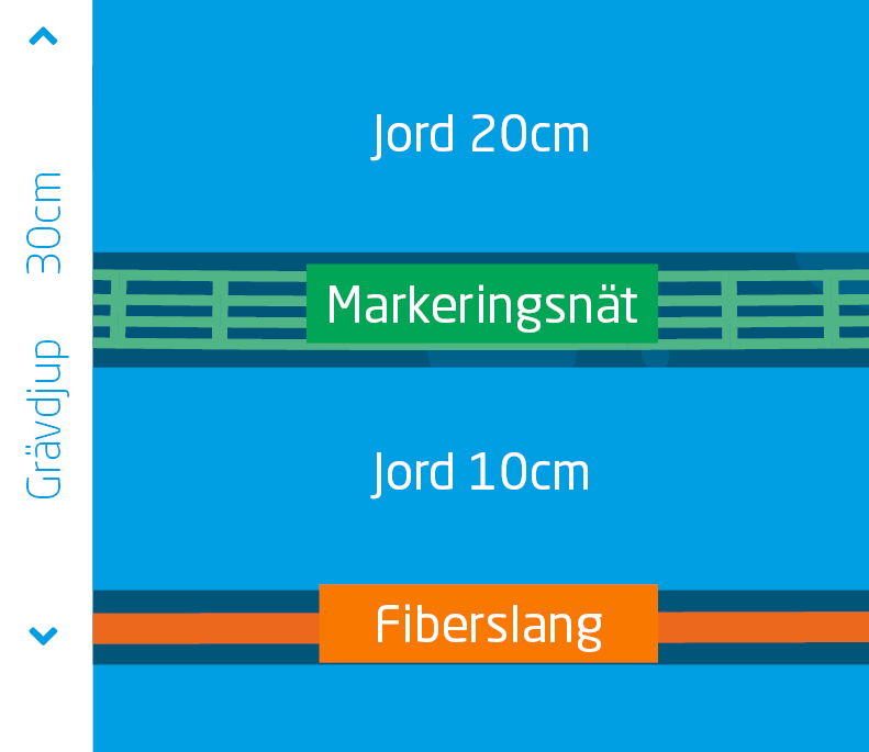För att kunna hitta fiberslangen används ett markeringsnät, vilket placeras ovanpå jorden. Markeringsnätet och jorden fungerar också som ett skydd för att undvika avgrävning av fiberslangen i framtiden.Lämna även ca 1 m överskott av markeringsnätet vid husväggen så söktråden i markeringsnätet kan klamras fast i kabelskyddet. Detta för att underlätta om felsökning behövs i framtiden. Täpp sedan igen grävfåran med jord upp till marknivån.