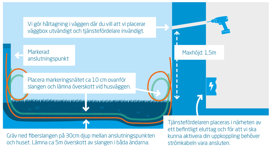 När fastighetsägarna i området har grävt ner fiberslangarna bokar vi tid med dig för att installera fiberutrustningen. Vi är tacksamma om du i god tid före besöket flyttar undan eventuella möbler som kan utgöra hinder vid installationen.Utifrån var du har bestämt att tjänstefördelaren ska placeras invändigt och därmed väggboxen utvändigt, borrar vi hål i husväggen och monterar fiberutrustningen över borrhålet. Vi borrar med lutning utåt för att undvika vattensamlingar, och vi rekommenderar ett torrt, tempererat rum i närheten av ett eluttag eftersom tjänstefördelaren behöver ström. Borrhålets diameter är 18mm, och maxhöjden utvändigt är 1,5m där väggboxen monteras.