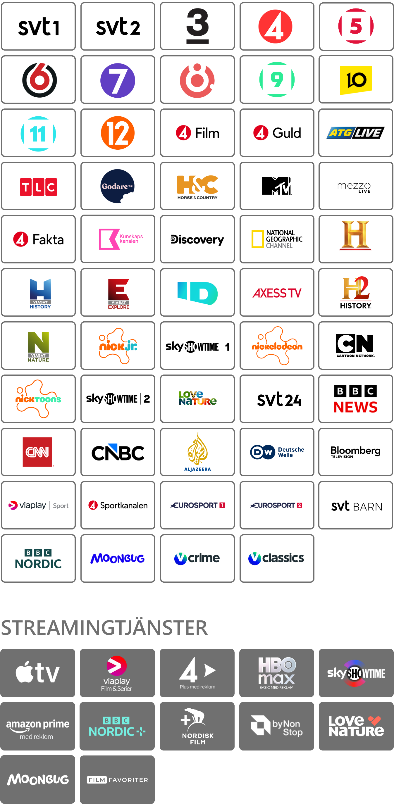 Med detta tv-paket får du ett brett kanalutbud med de stora svenska tv-kanalerna och något för alla att titta på. I Standard Plus ingår även flera stora streamingtjänster med mängder av film och seriesuccéer.